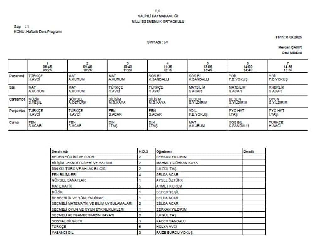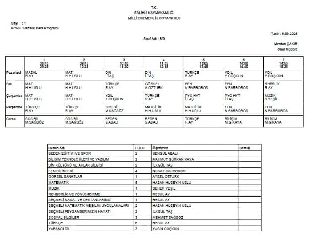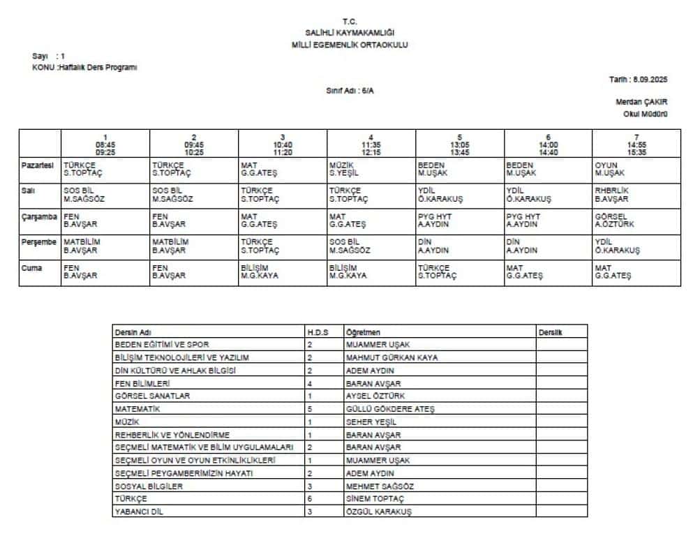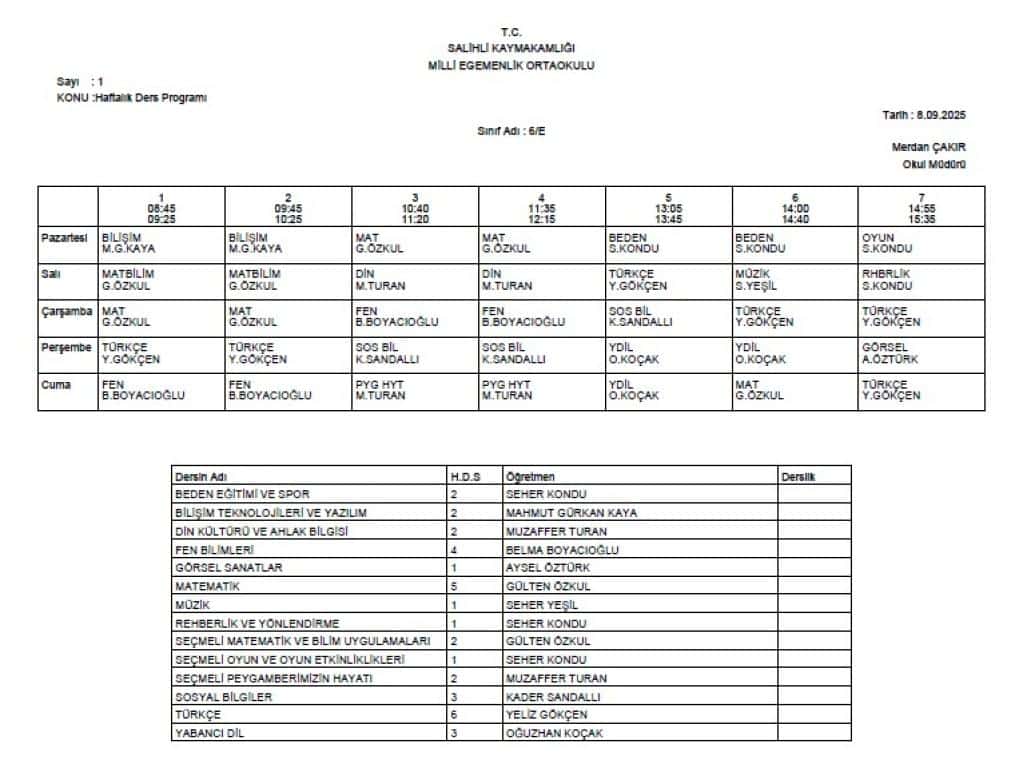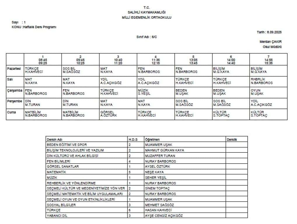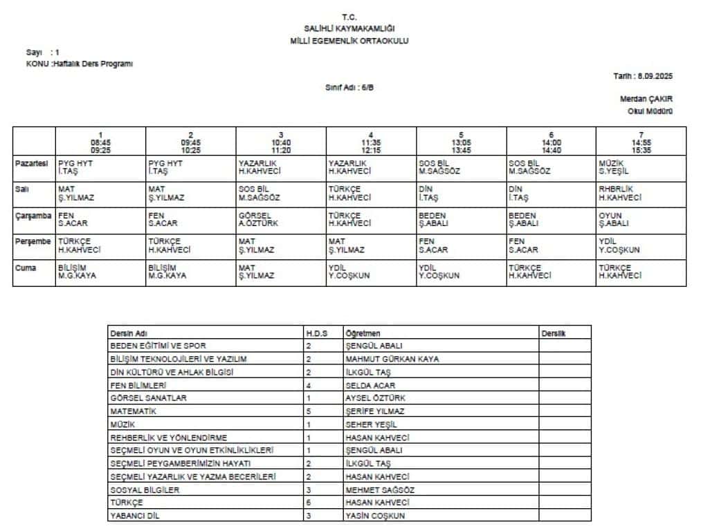2025-2026 EĞİTİM ÖĞRETİM YILI MİLLİ EGEMENLİK ORTAOKULU DERS SAATLERİ ÇİZELGESİ | ||||||
